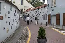 Literatų Street (literally: Literati Street; Lithuanian: Literatų gatvė) is one of streets in the Old Town of Vilnius, the capital of Lithuania.[2] It is a short narrow street mostly known for public display of decorative and artistic plaques dedicated to writers who have lived and worked in Vilnius or otherwise have shared a connection with Vilnius and Lithuania.[3][4] The artwork was first added in 2009 when Vilnius was designated as the European Capital of Culture and has grown to some 200 plaques.[5]