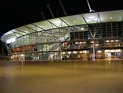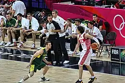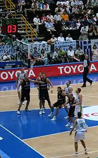 For the fourth post-independence Olympics, basketball captain Saulius Štombergas was given the honor to bear the Lithuanian flag during the opening ceremony.[103] The Olympic basketball for Lithuania started slowly, laboring to a victory against the African champions Angola 78–63, with their opponents shooting an excellent 52% from the three-point line. Lithuanian national team also had difficulties with Puerto Rico, depending on a high average of three-pointers to beat the NBA-heavy squad by 98–90. Then Lithuanians, in front of 12,000 spectators, achieved revenge against their Greek hosts, defeating them 98–76. The next match would be against the United States, which again featured major NBA stars such as Allen Iverson, Tim Duncan, and LeBron James, but had already been proven as faltering following a defeat to Puerto Rico. Lithuania managed to beat the United States 94–90, only the fourth defeat by the Americans in the Olympic stage.[104] Jasikevičius, who had lost a possible buzzer beater against the Dream Team four years before, managed to score 28 points, including a decisive 10-point barrage in 69 seconds that gave Lithuania the lead in the final minutes.[105] While the fifth game, versus Australia, was not significant for the group standings as the Lithuanians had already secured the first spot in the group, the Lithuanians still won 100–85, maintaining their good run.[106]