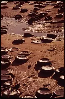 Tires are the most often dumped hazardous waste. In 2007 the United States generated 262 million scrap tires.[20] Thirty-eight states have laws that ban whole tires being deposited in landfills.[21] Many of these discarded tires end up illegally dumped on public lands. Tires can become a breeding ground for insect vectors which can transmit disease to humans.[22] Mosquitoes, which breed in stagnant water, can transmit West Nile virus and malaria. Rodents nest in accumulated tires and can transmit diseases such as Hantavirus.[22]