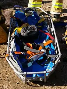 A Stokes basket, also called a Stokes stretcher or Stokes litter, is a metal wire or plastic litter widely used in search and rescue.[1] Its key feature is that it can be disassembled for transport in backpacks or by pack horse.
