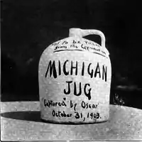 When Yost and the team came into Minneapolis for the 1903 game, student manager Thomas B. Roberts was told to purchase something to carry water. Yost was somewhat concerned that Gopher fans might contaminate his water supply.[6] Roberts purchased a five-gallon jug for 30¢ from a local variety store in Dinkytown.[7][8] The jug itself is known as a Red Wing Pottery "five gallon beehive jug", and was made in Red Wing, Minnesota.[9][2]