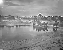 There were two primary crossings of the Little Colorado—one at the Grand Falls, and one at Black Falls, a smaller waterfall some 10 miles (16 km) downstream. It was easier to ford the river at the two waterfalls because at that point, it flows over hard bedrock, making the crossing much easier. The Mormons also made many attempts to construct dams on the river to provide irrigation water—as far upstream as the confluence of the river's forks and as far downstream as below Grand Falls—but most of them failed because of the Little Colorado's fickle variations in discharge.[19] Finally, they managed to construct one at Joseph City that lasted for 29 years. Despite the continued hardships, the Mormons persisted, successfully established their colonies, and survived in the region for many decades.[19][20] Later, Hispanics began to move into the Little Colorado River watershed from the Rio Grande area, establishing St. Johns and Concho. American ranchers from New Mexico also began to colonize the region, creating Eagar and Springerville.[21] For many years, Mormons were the primary group living in the watershed until the 1960s, when their independent towns and farms were absorbed into the growing Arizonan economy.[10]