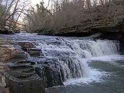 Its significance is primarily in its spectacular confluence with the main Duck River, just northwest of downtown Manchester in Old Stone Fort State Park. Both streams descend over a series of dramatic cascades just prior to the confluence, which occurs at the base of a table land which they surround on three sides. The perimeter of this table land is surrounded by a low stone wall generally 2 to 4 feet (0.6 to 1.2 m) in height.