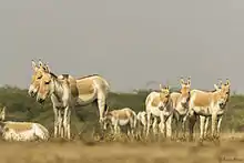 The Little Rann of Kutch is home to the Indian wild ass (khur). To conserve this species, the Indian Wild Ass Sanctuary (IWAS) was created in 1973 and covers nearly five thousand square km.[3] The sanctuary is also home to many species of migratory birds, such as the sarus crane, ducks, the Dalmatian pelican, and flamingoes, as well as land birds like the sandgrouse, the francolin and the Indian bustard. It is also home to various mammals such as the Indian wolf, desert fox and nilgai.