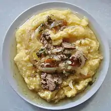 Liver can be baked, boiled, broiled, fried, stir-fried, or eaten raw (asbeh nayeh or sawda naye in Lebanese cuisine, liver sashimi). In many preparations, pieces of liver are combined with pieces of meat or kidneys, like in the various forms of Middle Eastern mixed grill (e.g. meurav Yerushalmi). Spreads or pâtés made from liver have various names, including liver pâté, pâté de foie gras, chopped liver, liverwurst, and Braunschweiger. A traditional South African delicacy, namely skilpadjies, is made of minced lamb's liver wrapped in netvet (caul fat), and grilled over an open fire.