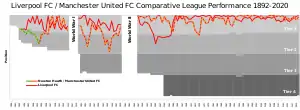 The Liverpool F.C.–Manchester United F.C. rivalry is a high-profile inter-city rivalry between English professional football clubs Liverpool and Manchester United. It is considered the biggest fixture in English football and one of the biggest rivalries in world football (along with derbies such as the Old Firm in Scotland, the Superclásico in Argentina, El Clásico in Spain, the Derby della Madonnina in Italy).[5][6][7][8][9][10][11][12][13][14][15][16][17][18] Players, fans and the media consider the fixture between the two clubs to be their biggest rivalry, above even their own local derbies, with Everton and Manchester City respectively.[19][20][21][22][23][10][24][25]