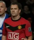 The rivalry has extended to the players as well: Wayne Rooney, a product of Liverpool's city rivals Everton who played for United from 2004 to 2017, described how he grew up hating the Reds (Liverpool),[56] while Liverpool's Steven Gerrard took a film crew on tour of his home where he showed off a collection of football shirts he had swapped with opposing players as part of the after-match routine; he pointed out that there were no Manchester United shirts in there and he would never have one of them in his house. Former Liverpool goalkeeper David James said: "I could never say I hated any United players just for being United players... But the rivalry became a habit, I suppose; on England trips Liverpool lads would eat at one table, United boys at another. There was tension there and we avoided one other". Liverpool defender Neil Ruddock once broke both of United forward Andy Cole's legs in a reserve match, later saying that "I didn’t meant to break both legs, I only meant to break one... I absolutely destroyed him... I know it's not big and it's not clever but it was great".[57] Manchester United's Gary Neville has been publicly vocal in the past with regards to his dislike of Liverpool. He notably drew the ire of Liverpool fans during the 2006 match at Old Trafford during which he celebrated Rio Ferdinand's last-gasp winner[58] by running to the stand where the away fans were seated while kissing the crest on his jersey and appearing to shout angrily towards them; he was fined and given a two-match ban by The Football Association but has stated on multiple occasions that he has never regretted his actions.[59][60][61] Following a fixture in which John O'Shea scored a stoppage-time winner in front of the Kop in 2007, Neville described O'Shea's achievement as "a lifelong dream" for himself. Previously in a Manchester derby during the 2003–04 season, Neville was sent off after attempting to headbutt Manchester City's ex-Liverpool midfielder Steve McManaman; as Paul Scholes commented, "It's fair to say the pair of them never got on too well together".[57] The animosity amongst players has also extended to the fans on many occasions, as in the case of Neville, who regularly became the subject of offensive chants from Liverpool supporters after the 2006 badge-kissing incident. In a retrospective special leading up to the January 2017 matchup at Old Trafford, Neville and his fellow Monday Night Football pundit and retired Liverpool one-club man Jamie Carragher both acknowledged that it was not uncommon for both United and Liverpool players, particularly locally-born youth academy graduates such as Bury-born Neville and Merseyside natives Gerrard and Robbie Fowler, to celebrate in front of rival fans and that "you just got to take it on the chin".[61]