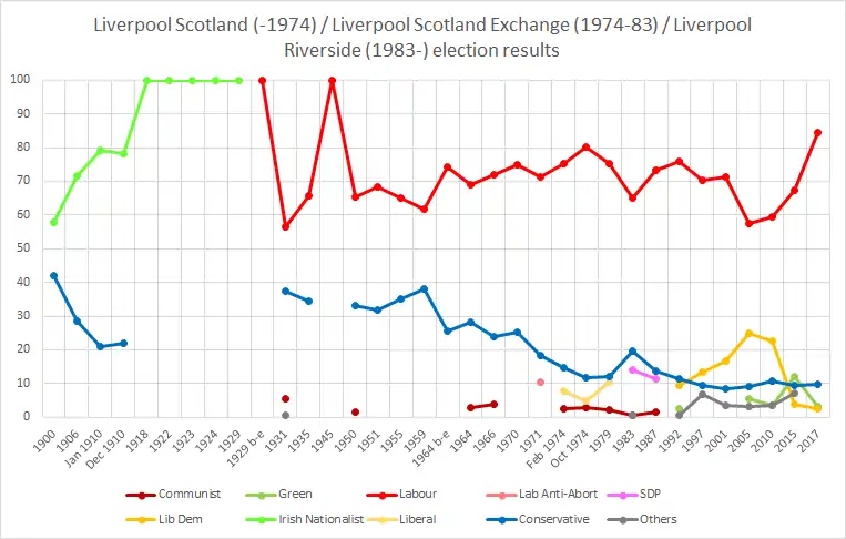 The area has been held by the Labour Party since the 1964 election (including predecessor seats); 1983—1997 by Robert Parry (ex-MP for Scotland Exchange, from 1974), 1997—2019 by Louise Ellman, and 2019—date by Kim Johnson. The 2017 result made the seat the 3rd safest seat by percentage of majority.[3]