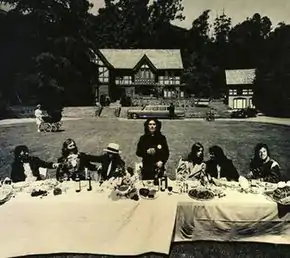 Author Elliot Huntley views Living in the Material World as a concept album on which the material–spiritual "quandary" evident in the title track is "eloquently expressed" through the artwork's mix of religious symbolism and an inner-gatefold photograph that showed "[Harrison's] band indulging in a gratuitously sumptuous feast".[91] The stretch-limousine image was a detail taken from this photo,[88] the concept for which reflected Harrison's view that the material world is not only related to money and possessions,[92] but to "everything which is gross, physical, or material as opposed to the subtle, astral or casual", as he puts it in I, Me, Mine when discussing the song.[2] NME critic Bob Woffinden also commented on the symbolism of this picture showing "Harrison with his musicians (Nicky Hopkins, Klaus Voormann, Jim Keltner, Ringo – the usual lot) enjoying a hearty repast, passing the no-doubt vintage wine, while in the background the longest limousine in the world awaits their convenience".[93][nb 6]