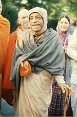 In his 1980 autobiography, I, Me, Mine, George Harrison credits the influence for "Living in the Material World" to A.C. Bhaktivedanta Swami Prabhupada,[2] the founder and leader of the International Society for Krishna Consciousness (ISKCON), commonly known as the Hare Krishna movement.[3] Harrison adds that the song specifically espouses the message that "we are not these bodies, we are in these material bodies in the physical world."[2] His friend Ravi Shankar once observed that Harrison exhibited tyagi, a trait meaning non-attachment or renunciation,[4] a point to which Shankar added: "He had everything – all the wealth, the fame, whatever he wanted. But he was not attached to it ... because he was searching for something much higher, much deeper. It does seem like he already had some Indian background in him [from a previous life]."[5] Harrison later said of life in the material world, referring to the need to break the cycle of rebirth associated with reincarnation:[6] "The whole point to being here, really, is to figure a way to get out."[7][8]