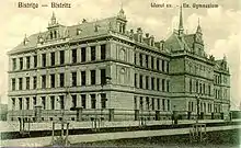 The school building, which dates to the Austro-Hungarian period, initially housed the Lutheran Gymnasium, and was used by the city's German-speaking Transylvanian Saxon population. Preparation began in 1900, when the old school was sold and the revenue used to purchase a lot. After additional funds were raised through donations, construction work began in 1908 and was completed in 1911, at which point it went into use. The present institution was established in 1923, following the union of Transylvania with Romania, when it became the first Romanian-language high school in Bistrița. During World War II, the bulk of the local Saxons emigrated to Germany, and the few remaining students were not enough to fill the school. Thus, the building passed to the Romanian high school beginning with the 1944-1945 year.[1]