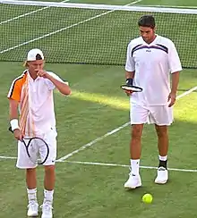 In 2003, Hewitt defeated former No. 1 Gustavo Kuerten for the championship at Indian Wells.[21] But at Wimbledon, as the defending champion, Hewitt lost in the first round to qualifier Ivo Karlović. Hewitt became the first defending Wimbledon men's champion in the open era to lose in the first round. Only once before in the tournament's 126-year history had a defending men's champion lost in the opening round, in 1967, when Manuel Santana was beaten by Charlie Pasarell.[22] Hewitt was only the third defending Grand Slam champion in the open era to lose in the first round, after Boris Becker at the 1997 Australian Open and Patrick Rafter at the 1999 US Open. After Wimbledon in 2003, Hewitt lost in the final of the tournament in Los Angeles, the second round of the ATP Masters Series tournament in Montreal, and the first round of the ATP Masters Series tournament in Cincinnati.[23] At the US Open, Hewitt lost in the quarterfinals to Juan Carlos Ferrero.[24] Hewitt played only Davis Cup matches for the remainder of the year, recording five-set wins over Roger Federer[25] and Juan Carlos Ferrero in the semi-finals and final respectively, as Australia went on to win the Davis Cup.[26] Hewitt used much of his spare time in late 2003 to bulk up, gaining 7 kg.
