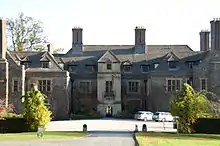 Llangoed Hall to the north of the village was built in 1633 by the Williams family of Old Gwernyfed in nearby Aberllynfi. It was lost to the MacNamara family (apparently after a game of cards) in about 1800 and subsequently much rebuilt. A London hatter called Archibald Christy bought the house in about 1860 and later had it extensively redesigned by the architect Clough Williams-Ellis, who formed the romantic notion that it was the site of the original 'White Court'. In 1987 the house was bought and much restored in Edwardian style by Sir Bernard Ashley, who subsequently opened it as the Llangoed Hall Hotel and fabric design centre.[3] It is now a grade II* listed building.[4]