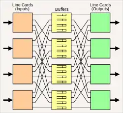 As shown in the figure to the right, a load-balanced switch has N input line cards, each of rate R, each connected to N buffers by a link of rate R/N. Those buffers are in turn each connected to N output line cards, each of rate R, by links of rate R/N. The buffers in the center are partitioned into N virtual output queues.
