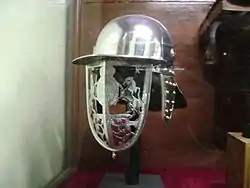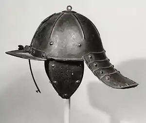 The lobster-tailed pot had a rounded skull-piece, which was sometimes fluted. The skulls of English-made helmets were usually formed from two sections, joined by a raised comb running from front to back; the skulls of helmets manufactured on the continent were most often raised from a single-piece of metal. Cheekpieces, commonly made in one piece but occasionally articulated, were attached to the skull by leather strapping; however, the better quality examples are sometimes hinged. To protect the face there was either a fixed forward projecting peak that incorporated a sliding nasal bar retained by a large screw, or a hinged peak with three attached bars. Finally, the helmet had a laminated defence (or a single-piece of plate ridged to imitate separate lames) to protect the back of the head and neck that was said to resemble the tail of a lobster.[2][3] Another common name for the helmet was the "harquebusier's pot", the harquebusier being the most common type of cavalry in Western Europe during the 17th century.[4] The single nasal-bar type was characteristic of Continental Europe, whilst the three-barred type with a pivoting peak was more widely used in the British Isles.[5] Many European-made lobster-tailed pot helmets were later imported to Britain during the English Civil War. Occasionally, older helmets like the burgonet or sallet were modified to resemble the 'lobster-pot.'[6] As stated by General George Monck in 1644, the "headpiece with three small bars" was intended to be pistol-proof.[7]