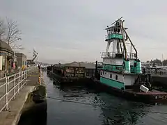 On horse-drawn and mule-drawn canals, snubbing posts were used to slow or stop a boat in the lock. A 200-ton boat moving at a few miles an hour could destroy the lock gate. To prevent this, a rope was wound around the snubbing post as the boat entered the lock. Pulling on the rope slowed the boat, due to the friction of the rope against the post.[18] A rope 2½ inches (6.3 cm) in diameter and about 60 feet (18 meters) long was typically used on the Erie Canal to snub a boat in a lock.[19]