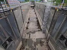 The cill exposed in the deep Pont de Flandre lock on the Canal Saint-Denis, Paris