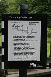 A swell was caused by opening suddenly the paddle valves in the lock gates, or when emptying a lock.[15] To help boats leave (downstream) a lock, the locksman would sometimes open the paddles to create a swell, which would help "flush" the boat out of the lock. In one case, a boatsman asked for a back swell, that is, open and shut the paddles a few times to create some waves, to help him get off the bank where he was stuck.[16] If boats ran aground (from being overloaded) they sometimes asked passing crews to tell the upstream lock to give them an extra heavy swell, which consisted of opening all the paddles on the lock gate, creating a surge that affected the whole pound below.[17]