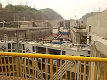 At the Three Gorges Dam on the Yangtze River (Chang Jiang) in China there are two stairsteps of five large ship locks (each 300 m long and 35 m wide) for ten-thousand-tonne ships. In addition to this there will be a boat lift (a large elevator) capable of moving a three-thousand-ton ship vertically in one motion. The locks and the boat lift provide a total lift of up to 113 metres.
