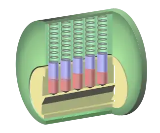 Wafer tumbler lock: without a key in the lock, the wafers (red) are pushed down by springs. The wafers nestle into a groove in the lower part of the outer cylinder (green) preventing the plug (yellow) from rotating.
