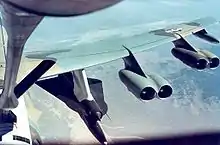 Following the accident, Johnson suggested launching the D-21 from the Boeing B-52 Stratofortress bomber and adding a solid rocket booster to get it up to speed.[12] The drone was modified by adding attachment points on its spine to mate with the carrying pylon on the B-52 and its belly attachment points were adapted to accommodate the rocket booster necessary to increase its speed and allow its ramjet to operate. Its vertical stabilizer was increased in size by approximately 20%. The modified drone version was designated D-21B (there was no D-21A). Two B-52Hs were modified to carry a pair of drones each by means of two large underwing pylons that replaced the smaller pylons used for the AGM-28 Hound Dog cruise missiles. The tail gunner's and electronic warfare officer's stations were replaced with two launch control stations. Command and telemetry systems were added, and high-speed cameras were installed to track the drones as they separated from the pylons. The launch control officer on the B-52H could communicate with the D-21B and could make it self-destruct.[13]