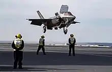 At-sea testing of the F-35B was first conducted aboard USS Wasp. In October 2011, two F-35Bs conducted three weeks of initial sea trials, called Development Test I.[233] The second F-35B sea trials, Development Test II, began in August 2013, with tests including nighttime operations; two aircraft completed 19 nighttime vertical landings using DAS imagery.[234][235] The first operational testing involving six F-35Bs was done on the Wasp in May 2015. The final Development Test III on USS America involving operations in high sea states was completed in late 2016.[236] A Royal Navy F-35 conducted the first "rolling" landing on board HMS Queen Elizabeth in October 2018.[237]