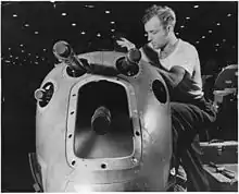 Manufacture of YP-38s fell behind schedule, at least partly because of the need for mass-production suitability making them substantially different in construction from the prototype. Another factor was the sudden required expansion of Lockheed's facility in Burbank, taking it from a specialized civilian firm dealing with small orders to a large government defense contractor making Venturas, Harpoons, Lodestars, Hudsons, and designing the Constellation for TWA. The first YP-38 was not completed until September 1940, with its maiden flight on 17 September.[45] The 13th and final YP-38 was delivered to the Air Corps in June 1941; 12 aircraft were retained for flight testing and one for destructive stress testing. The YPs were substantially redesigned and differed greatly in detail from the hand-built XP-38. They were lighter and included changes in engine fit. The propeller rotation was reversed, with the blades spinning outward (away from the cockpit) at the top of their arc, rather than inward as before. This improved the aircraft's stability as a gunnery platform.[46]