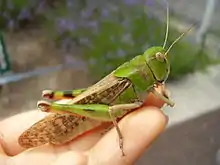Locusta migratoria manilensis, commonly known as the Oriental migratory locust, is a subspecies of the migratory locust (L. migratoria) in the family Acrididae. It is sufficiently different in size and structure from the African migratory locust to be considered a distinct subspecies of the migratory locust.[1] It is found in southeastern Asia and is an important agricultural pest in the region. It is normally a solitary insect but when conditions are suitable, it enters into a gregarious phase when the young form into bands which move together and the adults into swarms. Although outbreaks may have recently been fewer in number and size because of changes in agricultural practices and better locust detection, the insects remain active as crop pests and the potential for outbreaks is still present.