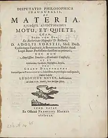 - (in Latin) De materia, ejusque affectionibus motu, et quiete": Meyer's 1660 Latin dissertation at Leiden University
