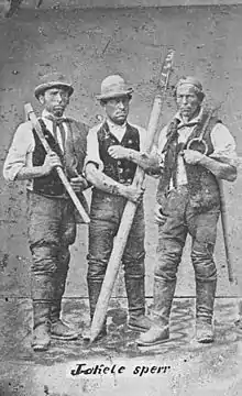 To ensure that logs drifted freely along the river, men called "log drivers" or "river pigs" were needed to guide the logs. The drivers typically divided into two groups. The more experienced and nimble men comprised the "jam" crew or "beat" crew. They watched the spots where logs were likely to jam, and when a jam started, tried to get to it quickly and dislodge the key logs before many logs stacked up. If they didn't, the river would keep piling on more logs, forming a partial dam which could raise the water level.[7] Millions of board feet of lumber could back up for miles upriver, requiring weeks to break up, with some timber lost if it was shoved far enough into the shallows.[8] When the jam crew saw a jam begin, they rushed to it and tried to break it up, using peaveys and possibly dynamite. This job required some understanding of physics, strong muscles, and extreme agility. The jam crew was an exceedingly dangerous occupation, with the drivers standing on the moving logs and running from one to another. Many drivers lost their lives by falling and being crushed by the logs.[7]