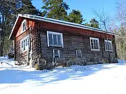 A log house, or log building, is a structure built with horizontal logs interlocked at the corners by notching. Logs may be round, squared or hewn to other shapes, either handcrafted or milled. The term "log cabin" generally refers to a smaller, more rustic log house, such as a hunting cabin in the woods, that may or may not have electricity or plumbing.