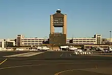 The distinctive central control tower, nearly a dozen stories high, is a local landmark with its pair of segmented elliptical pylons and a six-story platform trussed between them.
