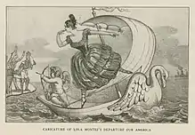 After a sojourn in Switzerland, where she waited in vain for Ludwig to join her, Lola made one brief excursion to France and then removed to London in late 1848. There she met and quickly married George Trafford Heald, a young army cornet (cavalry officer) with a recent inheritance.[19] But the terms of her divorce from Thomas James did not permit either spouse's remarriage while the other was living, and the beleaguered newly-weds were forced to flee the country to escape a bigamy action brought by Heald's scandalized maiden aunt.[19] The Healds resided for a time in France and Spain, but within two years, the tempestuous relationship was in tatters, and George reportedly drowned in 1856.[20] In 1851 she set off to make a new start in the United States, where she was surprisingly successful at first in rehabilitating her image.[2]:283