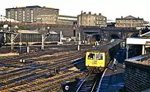 From 1863, part of King's Cross was an intermediate station. On the extreme east of the site, King's Cross York Road station was served by suburban trains from Finsbury Park before they followed the sharply curved and steeply graded York Road Tunnel to join the City Widened Lines to Farringdon, Barbican and Moorgate. In the other direction, trains from Moorgate came off the Widened Lines via the Hotel Curve,[23] to platform 16 (latterly renumbered 14) which rose to the main line level. Services to and from Moorgate were diverted via the Northern City Line from November 1976. The station remained in occasional use until it was completely closed on 5 March 1977.[79]
