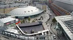 The new semi-circular departures concourse opened to the public in March 2012.[63][64] Situated to the west of the station behind the Great Northern Hotel, it was designed by John McAslan and built by Vinci.[65] It caters for much-increased passenger flows and provides greater integration between the intercity, suburban and underground sections of the station. The architect claimed that the roof is the longest single-span station structure in Europe and the semi-circular structure has a radius of 59 yards (54 m) and more than 2,000 triangular roof panels, half of which are glass.[60]