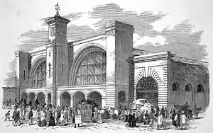 Plans for the station were made in December 1848 under the direction of George Turnbull, resident engineer for constructing the first 20 miles (32 km) of the Great Northern Railway out of London.[16][17] The station's detailed design was by Lewis Cubitt, the brother of Thomas Cubitt (the architect of Bloomsbury, Belgravia and Osborne House), and Sir William Cubitt (who was chief engineer of the Crystal Palace built in 1851, and consulting engineer to the Great Northern and South Eastern Railways). The design comprised two great arched train sheds, with a brick structure at the south end designed to reflect the arches behind.[18] Its main feature was a 112-foot (34 m) high clock tower that held treble, tenor and bass bells, the last of these weighing 1 ton 9 cwt (1.47 tonnes).[19] In size, it was inspired by the 200 yards (180 m) long Moscow Riding Academy of 1825,[20] leading to its built length of 268 yards (245 m).[12][lower-alpha 1]