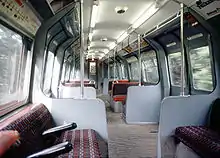The twelve aluminium-bodied motor cars were ordered from Cravens in 1958, and each was equipped with four traction motors, instead of the two which previous stock had used. They were controlled by a Pneumatic Camshaft Motor (PCM) controller, where an air-operated camshaft controlled the switching of the motors, which was itself governed by an accelerating relay.[6] This system had proved reliable in the control of two motors. In order for it to control four, without a major re-design, pairs of motors were wired together in series, and the controller switched between all four motors operating in series, and the two pairs operating in parallel. In order to protect against wheel-spin, the controller automatically reset if one motor of a pair began to run faster than the other. Whereas previous bogies had been asymmetric, to ensure that more weight was carried by the axle driven by the motor, the pivot was central as every axle carried a motor. One further innovation was that the fully automatic couplers at the outer ends of the trains were not "handed". Previously, trains were designated with 'A' and 'D' ends, and could only be coupled together by joining an 'A' end of one train to a 'D' end of another. This could cause operational problems, particularly on a line such as the Central, where operating a train right round the Hainualt loop resulted in it facing the wrong way. The 1960 stock avoided this problem by duplicating most of the connections in the automatic coupler, so that trains could be joined either way round. The cars also included a flat floor for the first time, rather than having a raised section over the motor bogies (previous stock had flat floors at the centre section only, with a rising transition in the two double doorways to a steeply curved floor 4 inches higher at either end over the bogies).