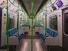 The D Stock consisted of six-car trains, as opposed to the seven-car trains of CO/CP and R Stock, whose cars were shorter: under normal operation, each train consisted of two 3-car units, and 20 of the units are double-ended to allow 3-car operations under exceptional circumstances.[4]