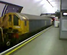 All battery locomotives are fitted with tripcocks which are operated by trackside equipment if the train passes a signal at danger. Eighteen (L15–L21 and L44–L54) are also fitted with Central line Automatic Train Protection (ATP). When they were built, locomotives L25 to L32 were fitted with Automatic Train Operation (ATO) equipment, which allowed them to work on the Victoria line. The tripcock could be isolated, and a trip valve performed a similar function, except that it was operated by the ATO controller. A special setting was provided that allowed the vehicles to move if they were not receiving safety track signals, but the maximum speed in these circumstances was limited to 10 mph (16 km/h). By the mid-1980s, this equipment had ceased to be used, as works trains were only run on the Victoria line when engineers had possession of the whole line.[10] Subsequently, some locomotives (L27–L32) have been fitted with a new type of Victoria line ATP equipment which was designed by Metronet on behalf of Transplant, the operator of the fleet. This system was installed during 2007 at Ruislip Depot. It is compatible with the new Distance-to-Go Radio (DTG-R) ATP system which has been implemented on the Victoria line by Westinghouse Rail Systems.[17]