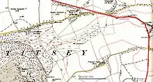 On Blythe Hill the road turns 9 degrees to the south, and crosses the River Pool, then turns another 6 degrees southward onto the next main alignment. Here the intact road was found to be made of gravel on pebbles and flints under a golf course. It then crosses the railway about 210 metres (230 yd) east of Beckenham railway station. Going through Beckenham it passes close to Langley House then east of West Wickham village centre, crosses Corkscrew Hill, and goes down to the Addington to Hayes road, where there was once a small settlement. From Rowdown Woods the Surrey/Kent county boundary follows the road, making a V shaped kink at Skid Hill where the road deviates from the alignment to cross a steep valley.[3] This alignment, marked by tracks and hedgerows, continues to the top of the North Downs above Titsey where it is more than 260 metres (850 ft) above sea level. Here the road makes a sharp turn eastwards to follow the ridge of the downs, passing south of Tatsfield church before beginning its descent of the escarpment on a terraceway, originally 3.8 metres (12 ft) wide, passing west of the rectory, to cross the Pilgrims Way. The road is followed by the Titsey-Tatfield parish boundary for 4 kilometres (2.5 mi).