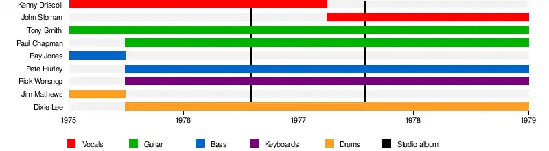 ![]() Image taken in 1977. From left to right: John Sloman, Tony Smith, Pete Hurley, Dixie Lee, Rick Worsnop, Paul "Tonka" Chapman. | |