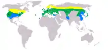 The long-eared owl has an extremely large distributional range. In Eurasia, they are distributed from the Iberian Peninsula and the British Isles (including almost the entirety of Ireland), in both of which they are found somewhat spottily but quite broadly, especially for an owl. From western France east through the remainder of Europe they are found nearly everywhere, though still usually quite common in these areas, there are small spots where they do not usually occur in Italy, Austria and Southeastern Europe.[1][7][20] In Scandinavia they are found only as a breeding species in about the southern two-thirds of Norway, Sweden and Finland while they usual persist year around in haunts in the southern tips of Norway and Sweden, respectively, as well as in all of Denmark. In coastal Norway they are found at their worldwide northern limit as breeding bird, with long-eared owls nesting as far north as in the Subarctic zone of Troms.[1][7][20] In latitudinal range, they are found as far south the Azores, the Canary Islands while their limited breeding range in north Africa is from Morocco to Tunisia, as well as seemingly in northernmost Algeria.[1][20][62][63] Out of Europe, they are found very spottily as breeders in Turkey, northernmost Syria, Israel and Lebanon.[1][62][63] They are quite broadly distributed within Russia, breeding in about the southern two-thirds of the country (north as far as roughly Chernyshevsky and Yakutsk) and often occurring year around in about the southern third of it (north to about the cities of Perm, Tyumen and Tomsk) and east to Siberia, ranging far as Sakhalin. Their range is continuous from Russia into most of Kazakhstan, Georgia, Kyrgyzstan, about half of Uzbekistan and infrequently into northern Afghanistan and Turkmenistan.[1][64] In the east, they range through most of Mongolia (absent from the southwest) and the western and eastern parts of northern China, with seasonally uncertain status in the Koreas. Long-eared owls are found throughout the islands of Japan but mainly winter only in points south of Osaka.[1][65] The long-eared owl occurs apparently only in winter in small spots of southern France, southern Greece, northwestern Egypt, northern Iran, southern Turkmenistan, broadly in much of Afghanistan, Pakistan and northern India (such as the Kutch, Punjab, Kashmir), as well as to the east in Bhutan, southern China, Taiwan and most of South Korea.[1][3][7][63][65] Irruptive wanderings have resulted in vagrant long-eared owls in various places such as the Faroe islands, Iceland and Madeira as well as Ryukyu Islands in the east.[3]