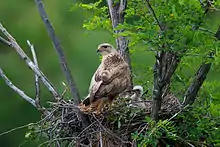 Often this species nests are located on a cliff ledge, crag or low rocks, often in fairly shaded relative to the often sunny environs.[3][18] In Kazakhstan, more than 75% of 53 nests were on such ledges or in granite niches, with a further 11% on power poles, 8% in trees and 4% on high hills less frequently nest ground, in a tree or steep slope or old large bird nest.[85] In Cyprus, of 22 nests, only 1 was in a tree, while the rest were a variety of cliffs from sea cliffs to mountainous areas of around 1,100 m (3,600 ft) elevation.[100] All known nests in northwestern China as well as in southwestern Iran were located on cliffs.[74][87] In Bulgaria, in the absence of natural rocks, the long-legged buzzards largely adapted to nesting alongside manmade quarries rather than use trees.[77] Nesting locations were exceptional then in the Ukraine where most (85.7%) were built in oak trees, with one additionally placed in a pear tree.[71] Data from the Volga region of Russia also suggests that tree nesting is common for the species there, especially in Malus apple trees.[101] Additionally, the few known nests from Pakistan have appear to be located in trees such as Abies firs or junipers.[16][102] Some nests along the perimeter of old buildings have been documented as well.[36][49] At times the long-legged buzzard will use the old nest of another species, apparently largely ravens such as common ravens (Corvus corax) or brown-necked raven (Corvus ruficollis).[19] Nests are frequently reused in subsequent years and added to over time.[4]
