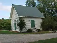 The one-room schoolhouse (c. 1800) was renovated and expanded in the 1950s for use as a lake cottage with kitchen, bathroom and sleeping loft. This building is a square-hewn wood log cabin. The Tarry family sheathed this building in barn siding and added a tin roof when the cottage was built. It was a girls' school for families in Mecklenburg County, Virginia, until the early 1900s. The teacher slept in an upstairs loft. After the school closed, the structure was used as a blacksmith shop.