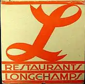 Longchamps was a chain of several upscale restaurants centered in Manhattan that consisted of twenty or more locations at its peak, including the Showboat Restaurant located in the Empire State Building. The chain's first location was opened in 1919.[1] Longchamps restaurants were known for their natty art deco furnishings and decorations by Winold Reiss,[2] and a number of designs for elements of their physical surroundings were drawn up by New York architect Ely Jacques Kahn,[3] originator of a colorful version of art deco architecture.[4]