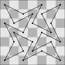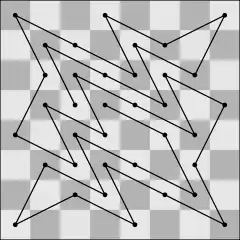 The longest uncrossed (or nonintersecting) knight's path is a mathematical problem involving a knight on the standard 8×8 chessboard or, more generally, on a square n×n board. The problem is to find the longest path the knight can take on the given board, such that the path does not intersect itself. A further distinction can be made between a closed path, which ends on the same field as where it begins, and an open path, which ends on a different field from where it begins.