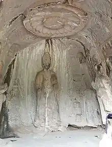There are several major grottoes with notable displays of Buddhist sculptures and calligraphic inscriptions.[3][5] Some of the main caves and the year when work began within them include: Guyang-dong (493), Binyang-dong (505), Lianhua-dong (520s), Weizi-dong (522), Shiku-si (520s), Weizi-dong (520s), Shisku (520s), Yaofang-dong (570), Zhaifu-dong (ca. 636), Huijian-dong (630s), Fahua-dong (650s), Fengxian-si (672), Wanfo-si (670-680s), Jinan-dong (684), Ganjing-si (684), and Leigutai-dong (684).[11] The Guyang, Binyang, and Lianhua caves are horseshoe-shaped.[12]