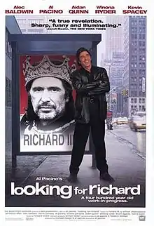 Looking for Richard is a 1996 American documentary film directed by Al Pacino, in his directorial debut. It is a hybrid film, including both a filmed performance of selected scenes of William Shakespeare's Richard III and a documentary element which explores a broader examination of Shakespeare's continuing role and relevance in popular culture. The film was featured at the Sundance Film Festival in January 1996[1] and it was screened in the Un Certain Regard section at the 1996 Cannes Film Festival.[2] Al Pacino won Directors Guild of America Award for Outstanding Directing – Documentaries.