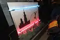 The installation by Josh Graff. Untitled, wood and neon garnished with broccoli and dolls