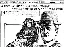 In December 1909, the authorities in St. Louis found traces of arsenic in the body of William J. Erder,[9] and murder indictments were issued by a grand jury against the two Doxeys, both of them having been arrested on suspicion.[10][11] Former Lieutenant Governor Charles P. Johnson was engaged as the attorney for both[12] The murder charges were separated, and Dora Doxey was put on trial in May and June 1910. She was found not guilty on June 3, and Loren was set free on June 7, the charges against him being dismissed.[4][13][14][15]